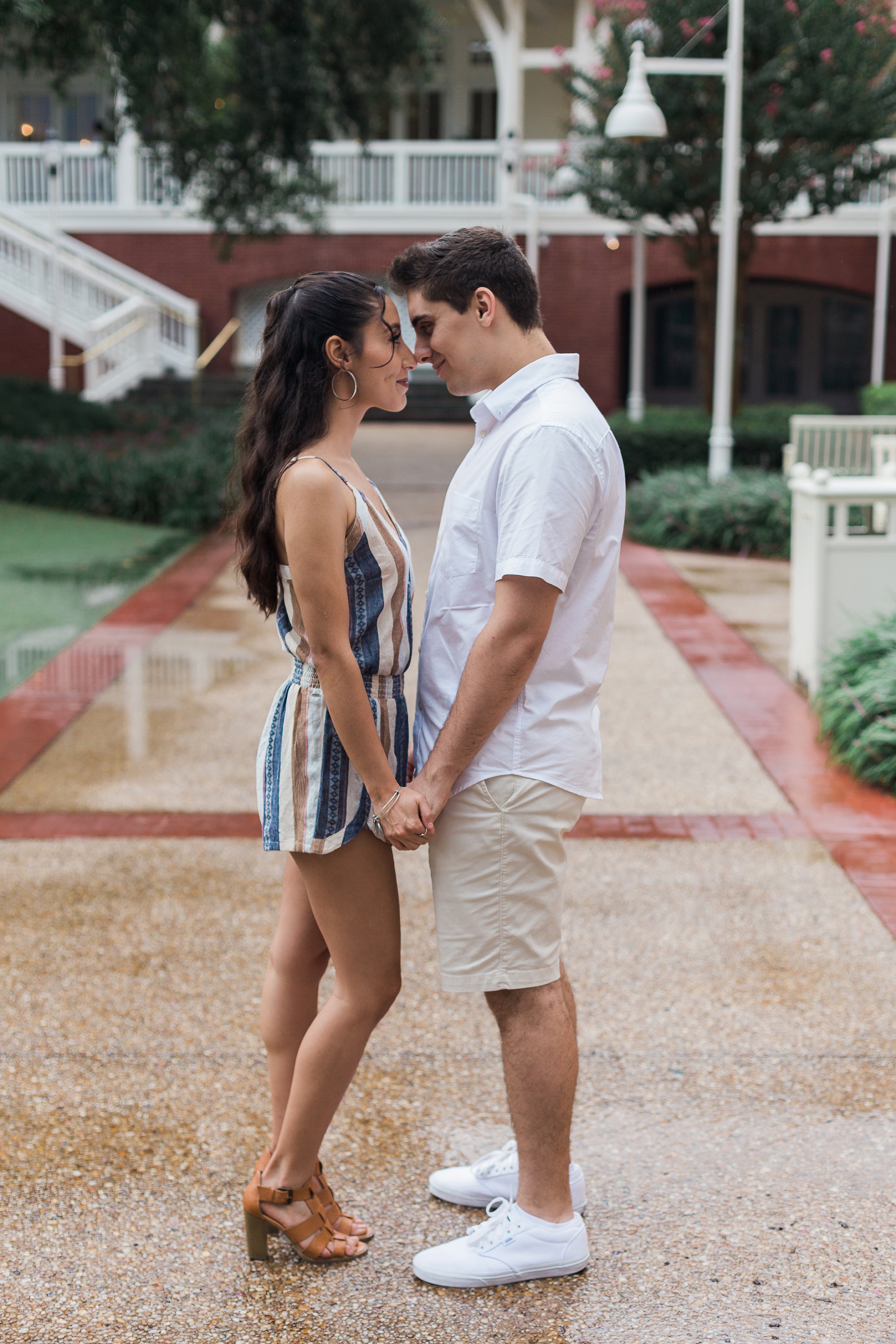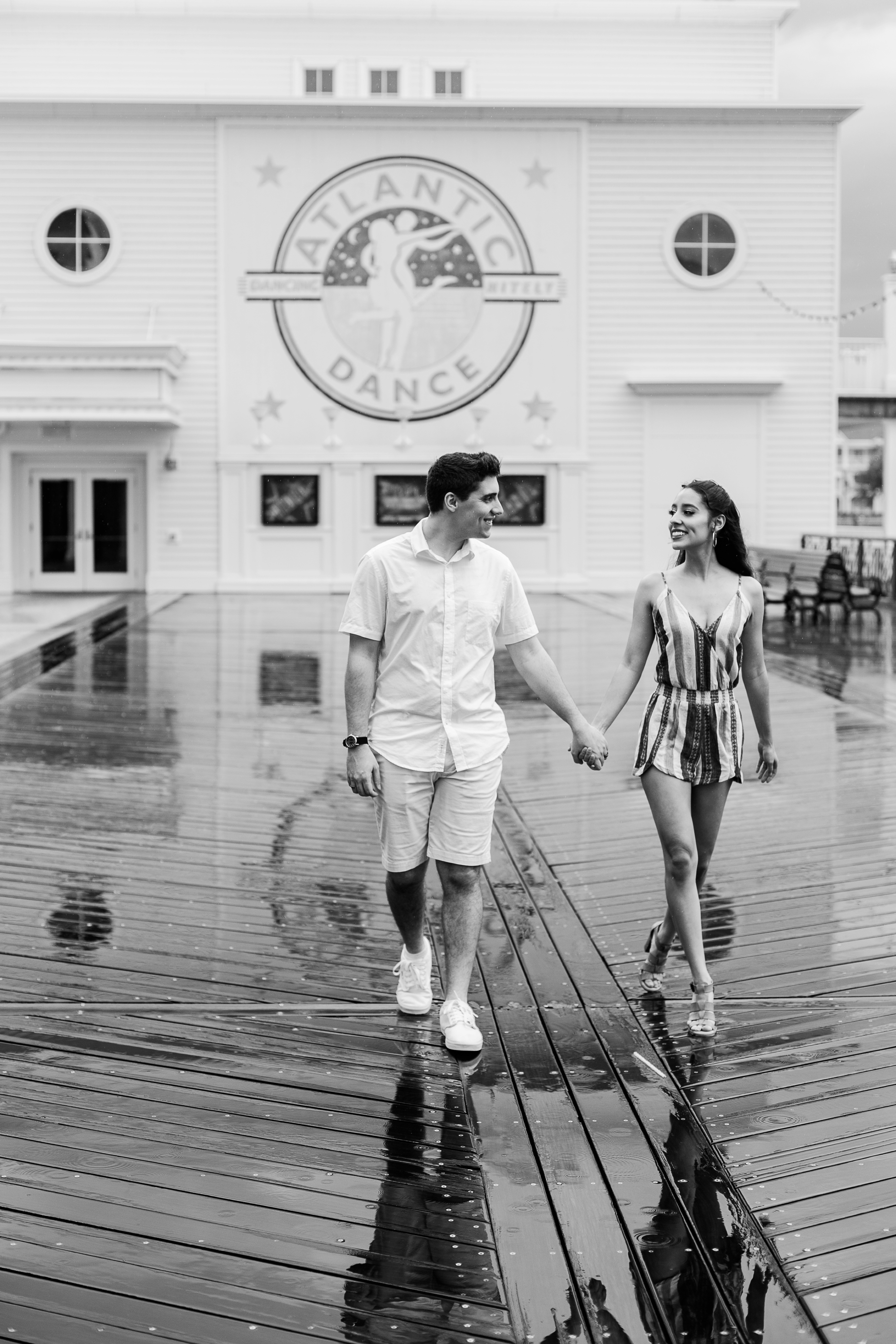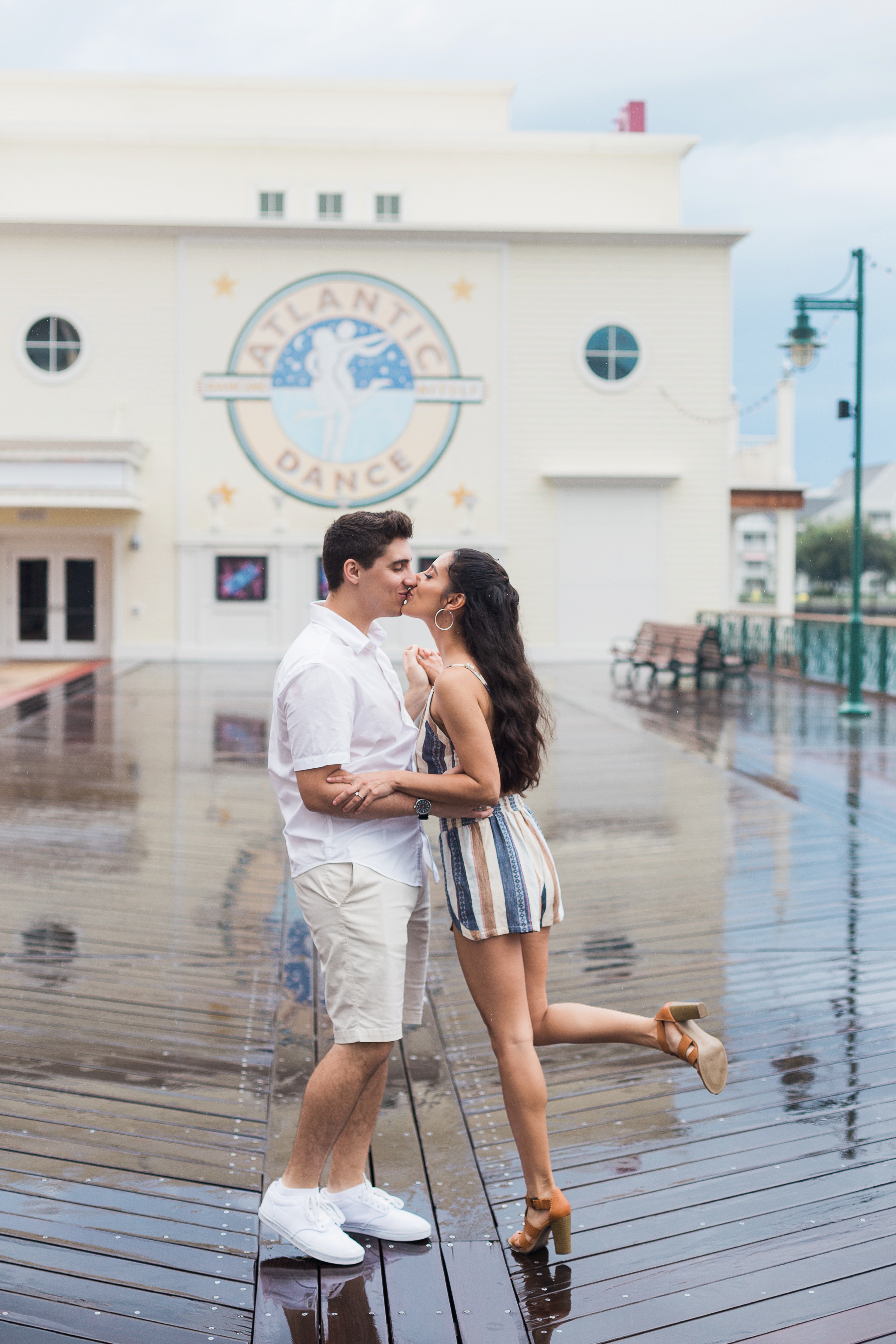 The couple chose Disney’s Boardwalk Resort. A very popular location for many of my clients and for good reason. But on this day, mother nature had it out for us. The session started with some sun but soon, the good ol Florida floodgates would open. Thankfully, there are some great awnings attached to Jellyrolls that we were able to take shelter under and continue shooting.